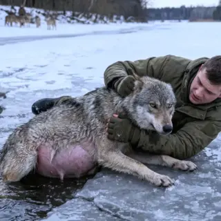 Не роздумуючи ні миті, далекобійник витягнув з крижаної води вагітну вовчицю! Він навіть не здогадувався, якою буде віддяка…