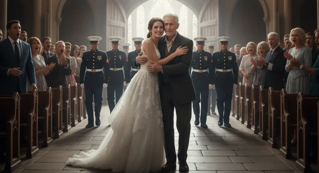 A low murmur rippled through the pews of the historic Charleston church. “Don’t tell me she actually invited him,” a guest whispered with disdain, her voice sharp enough to cut through the scent of lilies and old wood. The bride, a vision in ivory, was running—not walking gracefully, but running—towards the main entrance to embrace a man whose weathered appearance stood in stark contrast to the formal attire of everyone else. Many looked away, a wave of palpable discomfort sweeping through the congregation. But moments later, that discomfort turned to stunned silence as twelve United States Marines, resplendent in their formal dress blue uniforms, marched through the doors. They formed a perfect line, their movements sharp and synchronized, and in a single, powerful motion, they saluted the bride.
