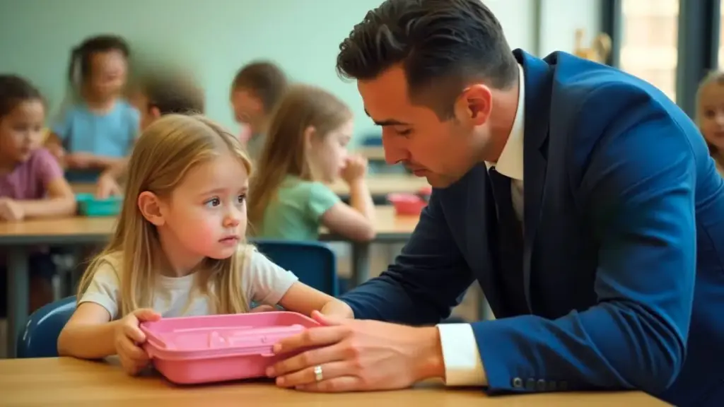 But in the far corner, he noticed one child sitting alone, a little girl no older than seven with dark braids falling across her shoulders. She had placed in front of her a faded pink lunchbox that clearly held no weight. Instead of eating, she was carefully pretending: arranging invisible plates, pouring imaginary drinks, and speaking softly as though hosting a fine restaurant.