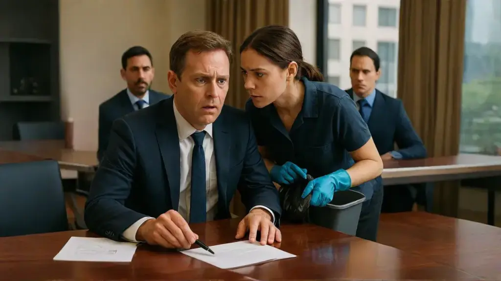 Anna, one of the cleaning staff, walked in with her cart. «Sorry, I’ll just empty the trash real quick,» she said softly and respectfully. No one seemed to mind; they were all too busy celebrating ahead of time. Anna walked over to the trash can next to David’s chair and bent down, pretending to adjust the bags.