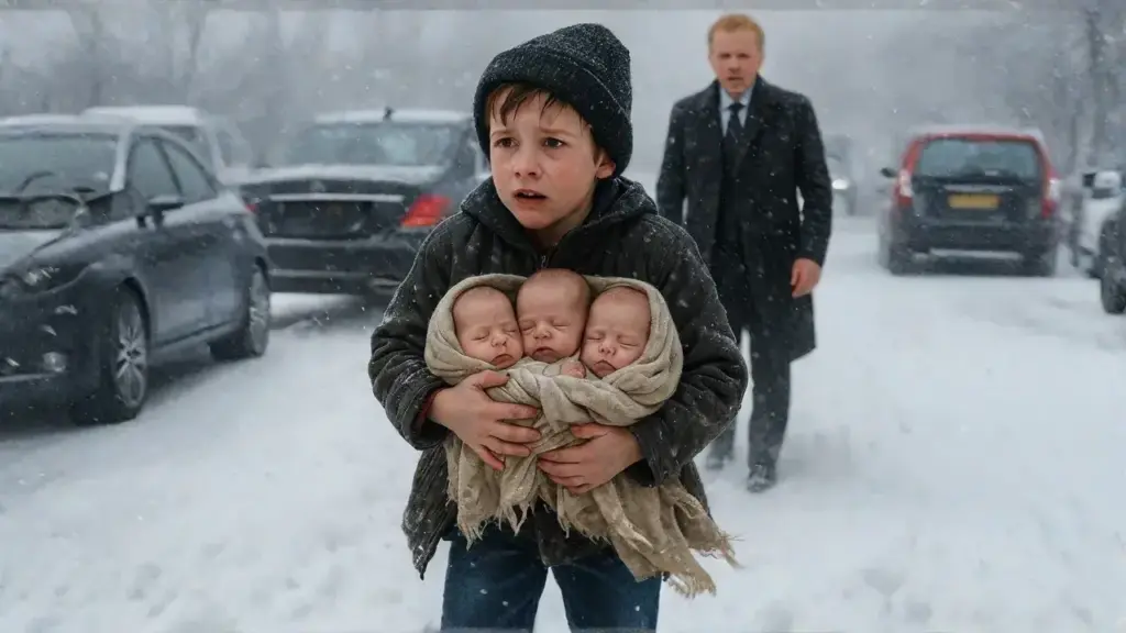 Out of the white haze, a small figure materialized, a ghost against the storm. He was a boy, no older than seven, his presence a fragile defiance against the elements. His jacket, thin and frayed at the cuffs, offered little protection, and his sneakers were soaked through, their soles riddled with holes. Yet, the biting cold seemed inconsequential to him. Cradled in his arms, held with desperate care, were three impossibly small infants, each swaddled in threadbare blankets.