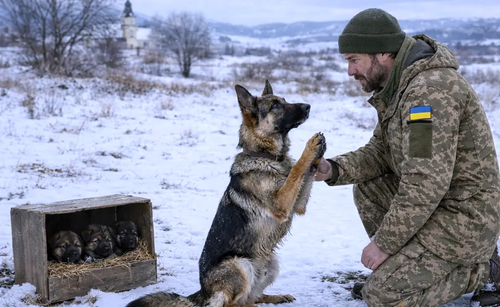 Німецька вівчарка склала дві передні лапи разом, наче молилася. Її троє крихітних цуценят тремтіли в розідраній картонній коробці поруч, просто на засніженому узбіччі траси. Повз них з ревом пролітали машини, здіймаючи хмари брудного снігу.