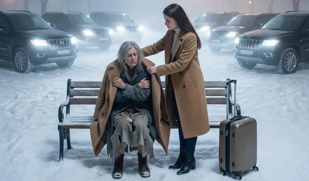 That was when she appeared: an elderly woman, barefoot, her skin turning an alarming shade of ashy purple, her silver hair whipped wild by the wind. She looked like the cold had already claimed her. Without a second thought, I stood up, took off my only warm coat, and wrapped it around her trembling shoulders.