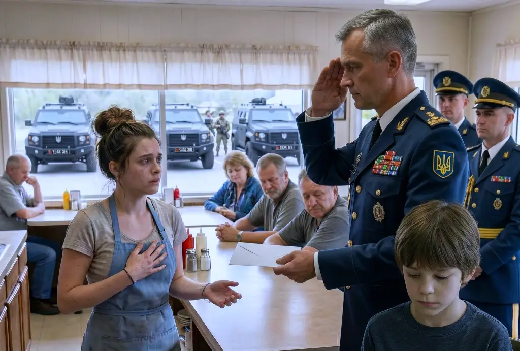 Из первой машины вышел мужчина. Его осанка была непоколебимой, позвоночник — словно стальной стержень. Он был одет в безупречную парадную военную форму, которая выглядела слишком официально на фоне обычной спальной улицы Киева. В руке в перчатке он держал единственный, аккуратно сложенный конверт. Это зрелище было настолько неожиданным, что ритм жизни в кафе не просто сбился — он замер. Кто были эти люди? И почему в тот миг, когда Елена вышла из-за безопасной стойки, все в зале инстинктивно поднялись на ноги?